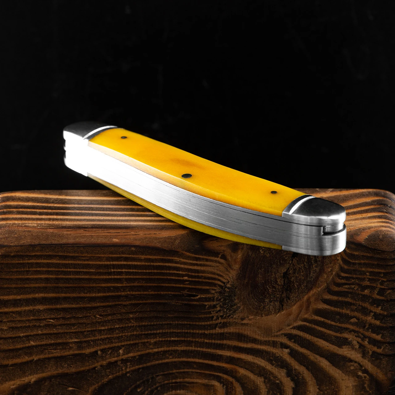 The Stockman Series is Cold Steel’s variation on the classic gentleman’s slip joint knife. It features handles made from authentic bone and is highlighted with polished metal bolsters. The rugged handles are substantially sized for hard work, even with gloved hands. It is constructed in a traditional Jack Knife pattern, with three polished stainless steel blades: a clip point blade for piercing and cutting, a spey blade for skinning and gutting, and a sheeps foot blade to avoid piercing during any slicing work. Its a practical knife that is useful for all sorts of chores, and it fits in well in almost any environment from urban to rural. It makes a great pocket knife that is perfect for domestic projects, outdoor use or as a hunting knife.