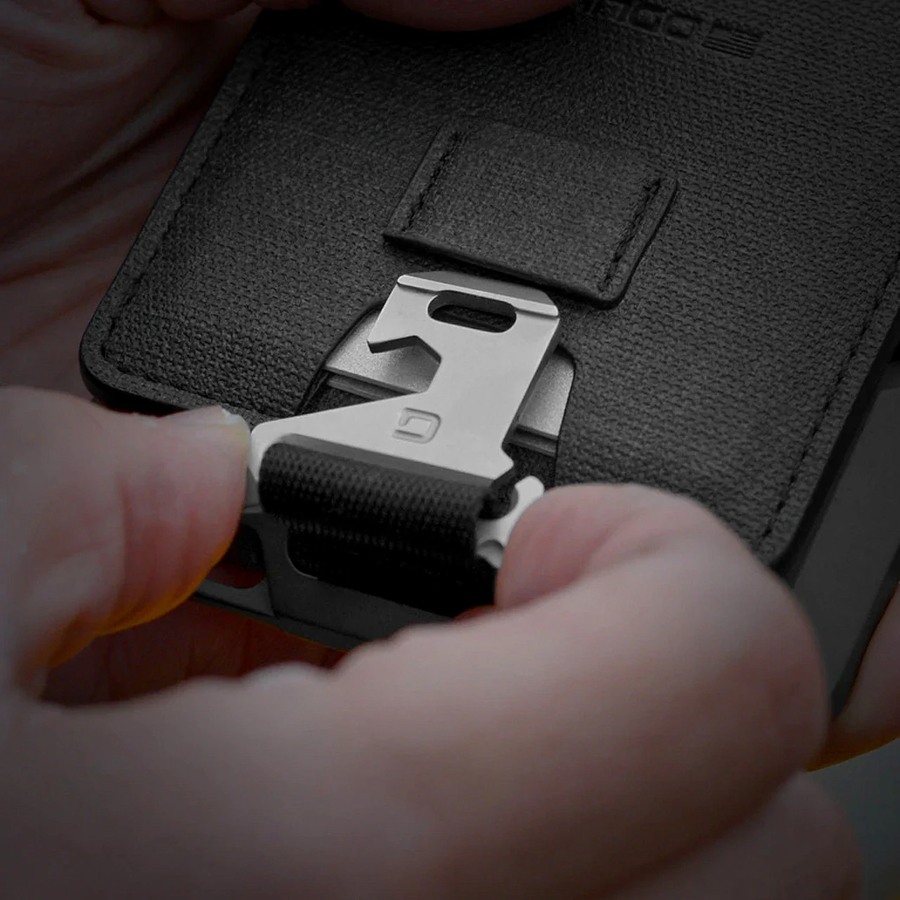 The M1 Spec-Ops Bifold Pocket variant comes with its pairing high carbon, heat treated MT04 Multi-Tool which has over 10 functions which are specifically designed to respond to emergency situations. The functions of the multi-tool include: a seat belt cutter, serrated/sharpened edges, chisel, 2 paracord tensioners, an O2 oxygen wrench, nail pryer, standard 1/4” inch hex wrench, and of course, a bottle opener. The MT04 Multi-Tool slides into the metal cavity where the cards sit and is nested securely onto the safety locks on the chassis.