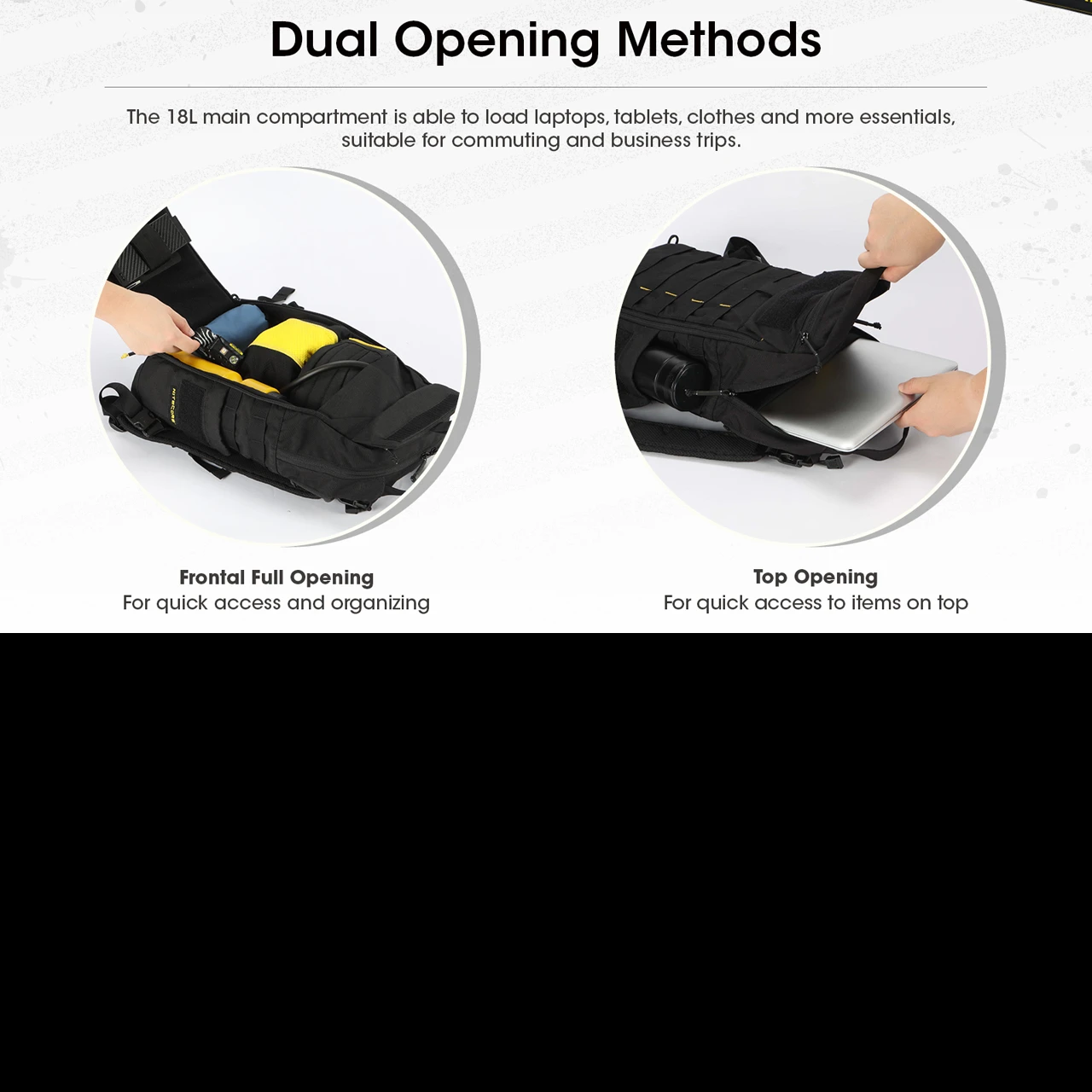 The backpack has dual opening methods; you can either open the whole front section for easy, efficient packing, or open the top of the bag for quick access to items packed towards the top.