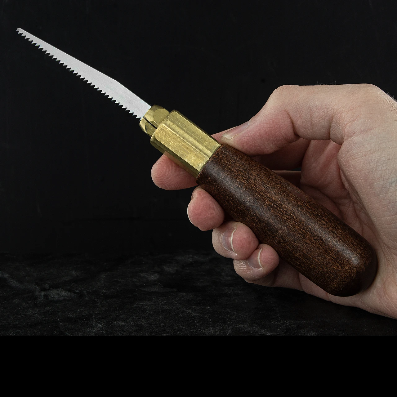 The carving set consists of a comfortable walnut handle with interchangeable double tempered high carbon (hollow ground) saw blades, enabling you to craft the exact shapes that you need.